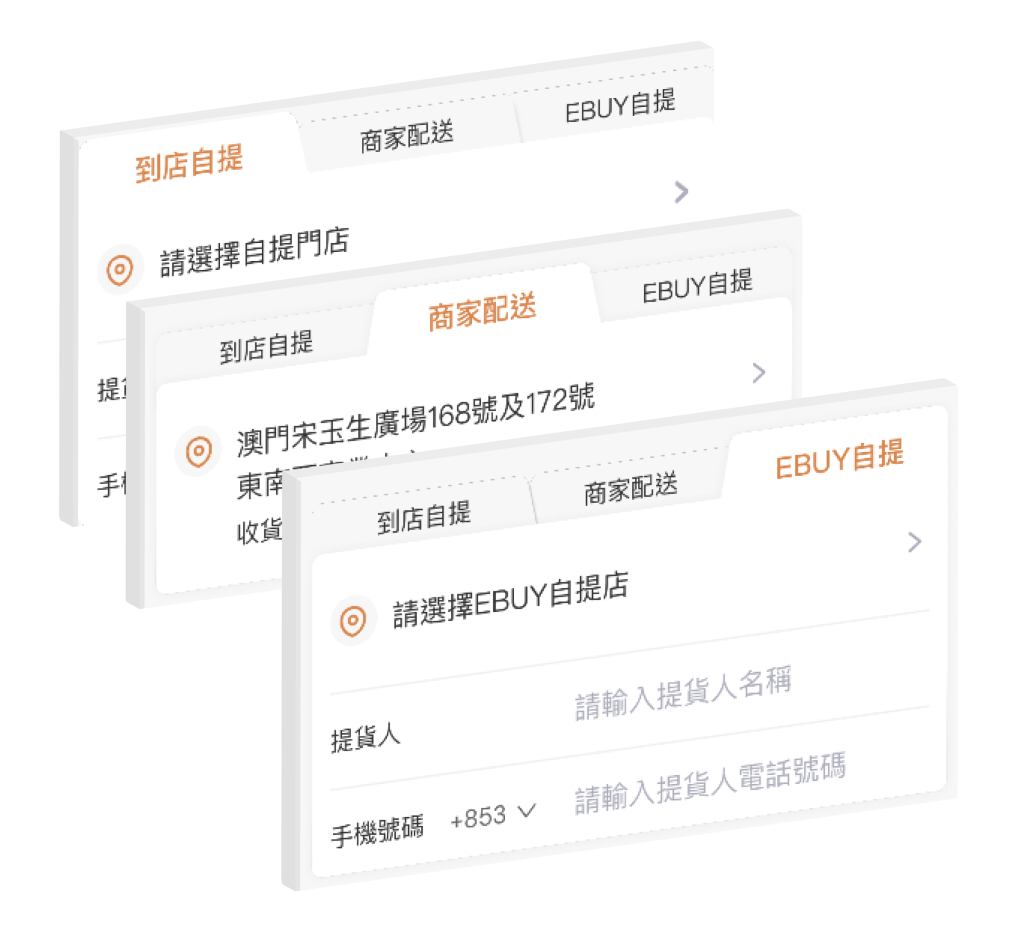 為了滿足商家與客戶多元的交收方式,我們設有店面自提/商家配送、eBuy自提、順豐速運、EMS、以至內地的快遞方式,如圓通速遞、申通速遞、申通申遞等,讓客戶能選擇交收方式,讓商戶能選擇物流公司,以配合雙方對物流方式的選擇。